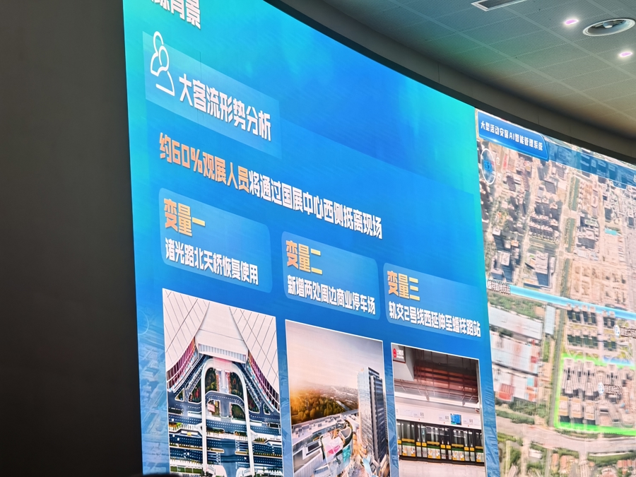 演练中,针对围绕诸光路北侧天桥恢复使用、新增两处周边商业停车场、轨交2号线西延伸至蟠祥路站等展馆周边交通条件变化,预测约有60%观展人员将通过国家会展中心西侧抵离现场,安保部门在轨交2号线4号口、5号口开展大客流疏导模拟,针对入离场大客流情况,制定四级分流措施。